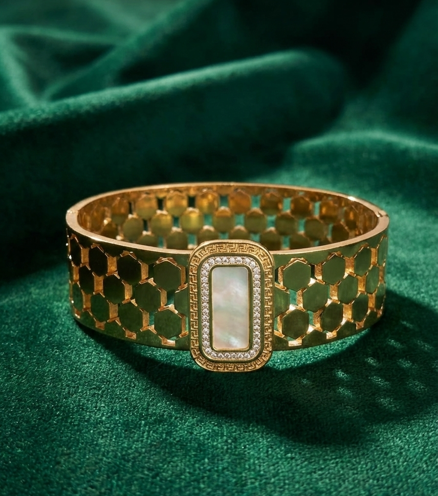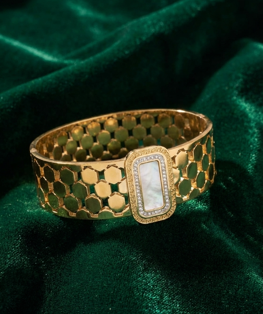 Elevate your elegance with this striking 18K PVD Gold Plated Bracelet by VdeLante, where timeless charm meets modern sophistication. Expertly crafted from high-quality stainless steel, this broad kada-style bracelet showcases a unique hexagonal link pattern that enhances the richness of its gold-tone finish.