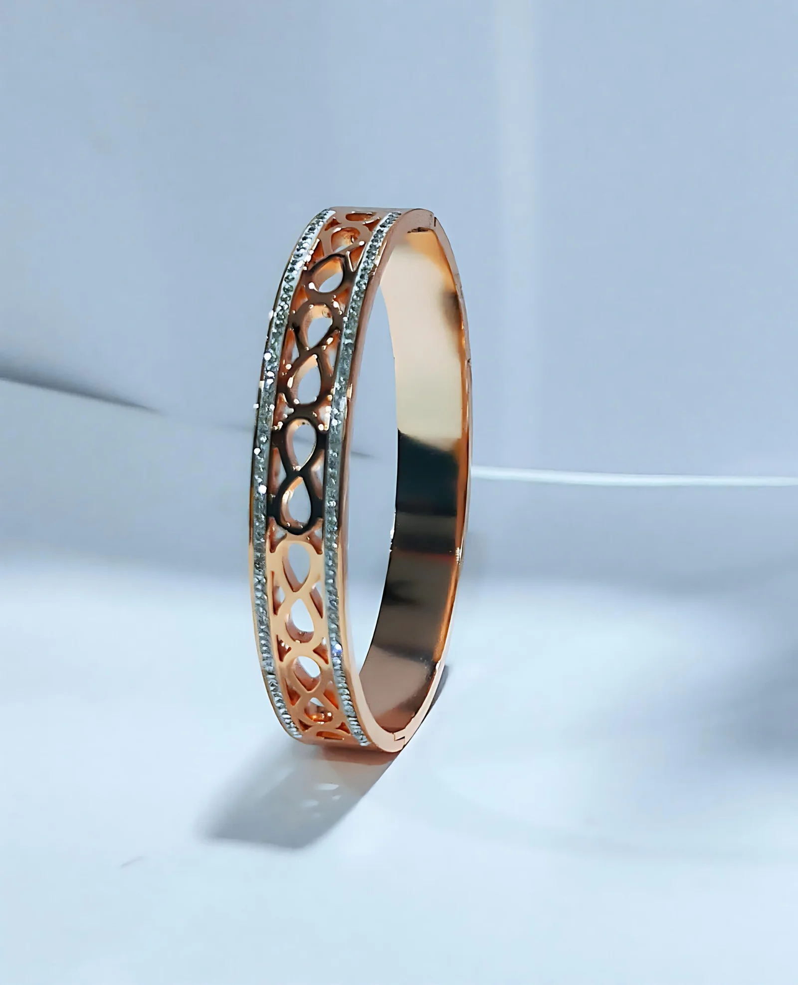 Crafted from high-grade stainless steel, the bracelet features premium PVD rose gold plating for a luxurious, tarnish-resistant shine. A line of sparkling zircon stones adds a sophisticated sparkle, making it ideal for both casual looks and evening wear.