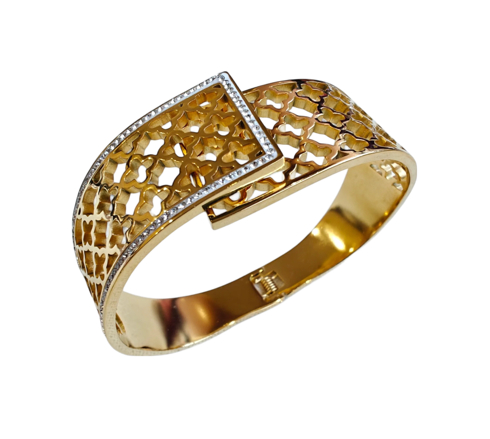 Add refined glamour to your jewelry collection with the VdeLante 18K Gold Plated Designer Cuff Bracelet. Crafted from premium stainless steel and finished with rich 18K gold plating, this bracelet features an intricate cutwork design enhanced with sparkling crystal accents for a luxurious statement look.