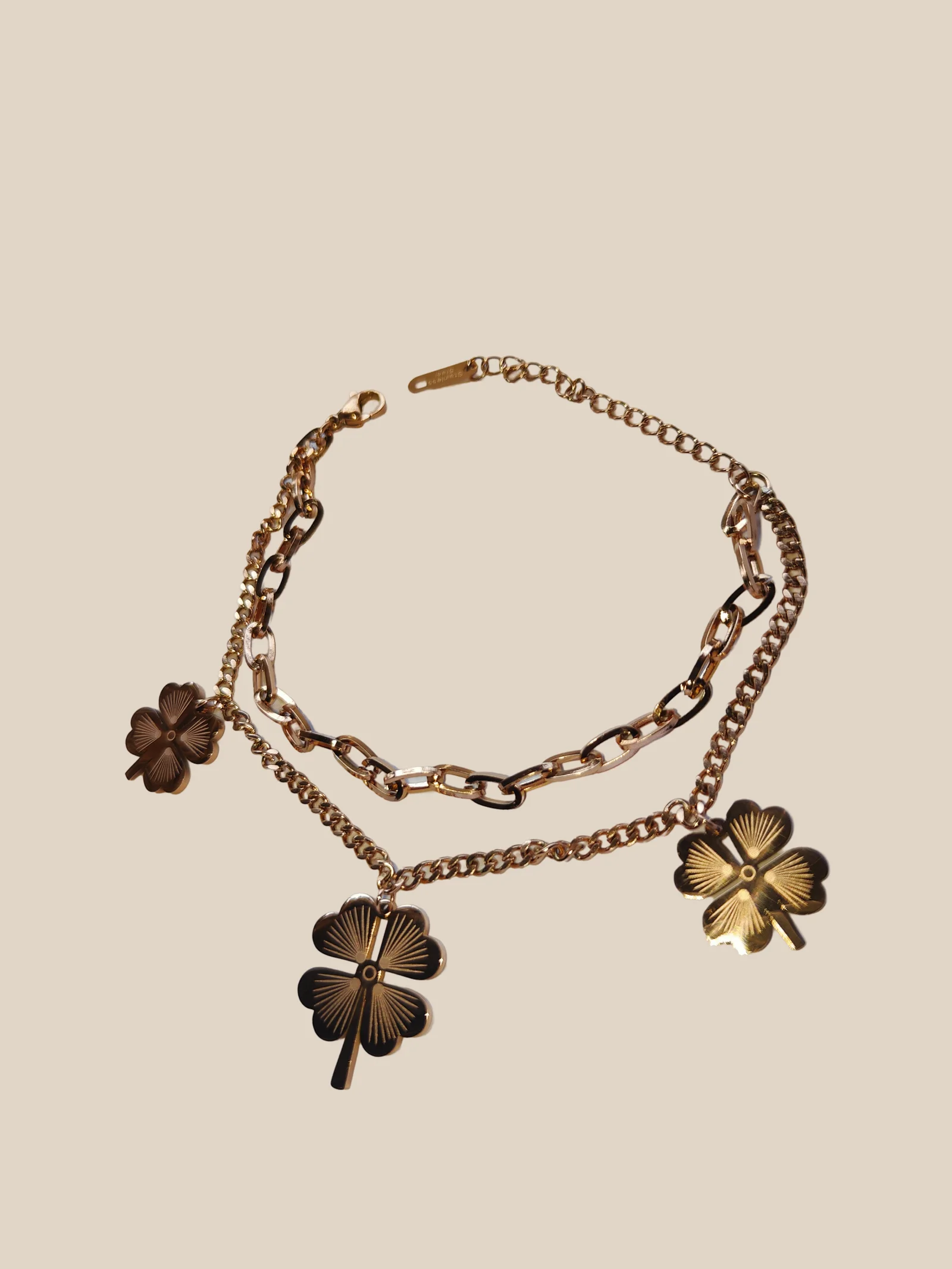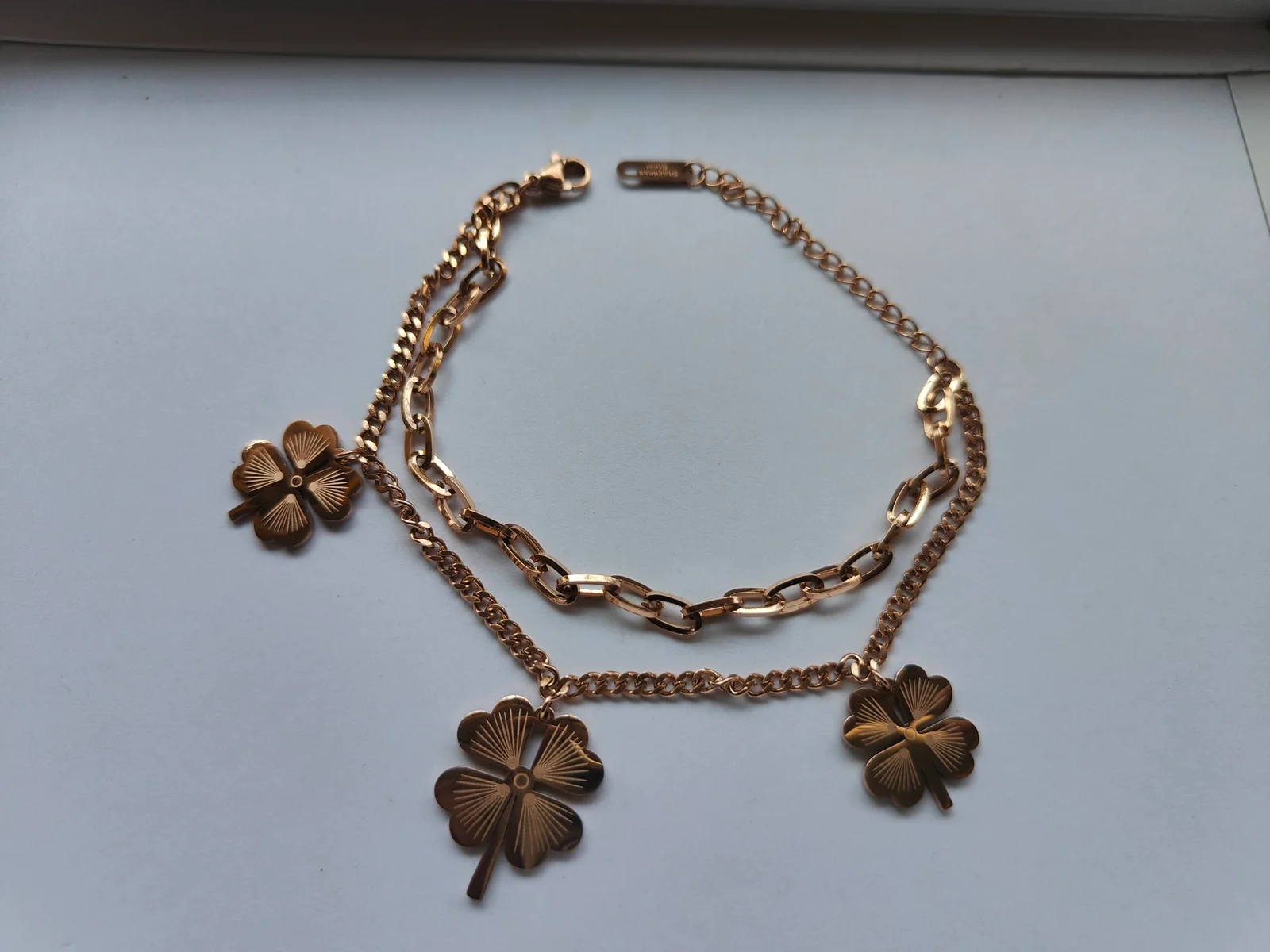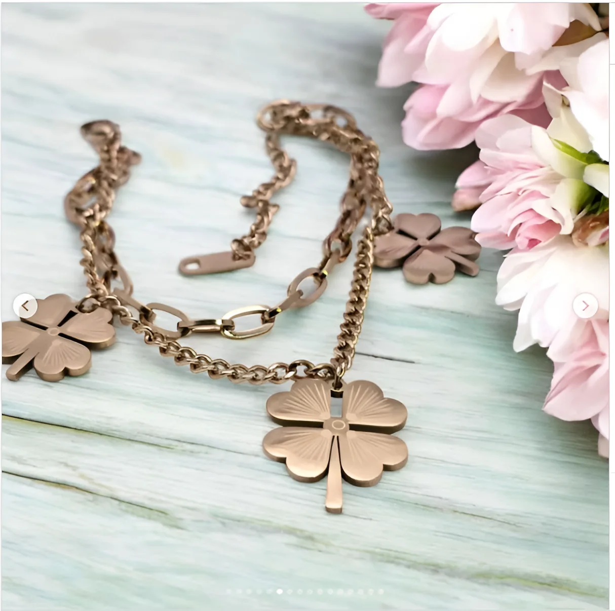 Elevate your everyday style with the VdeLante 18K PVD Gold Plated Dual Chain Bracelet—an elegant fusion of bold fashion and timeless charm. This unique bracelet features two contrasting chains and is adorned with intricately designed four-leaf clover charms, symbolizing luck and positivity.