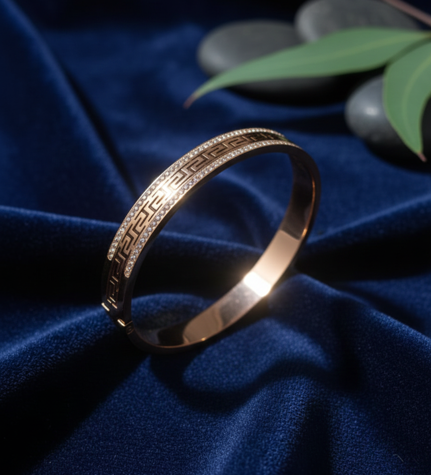 Add effortless elegance to your style with this 18K Rose gold plated bracelet from VdeLante. Designed with a refined Greek key pattern and sparkling detailing, this bangle offers a timeless, sophisticated look. Made from durable stainless steel, it is lightweight, waterproof, and resistant to tarnishing — ideal for everyday wear or special occasions.