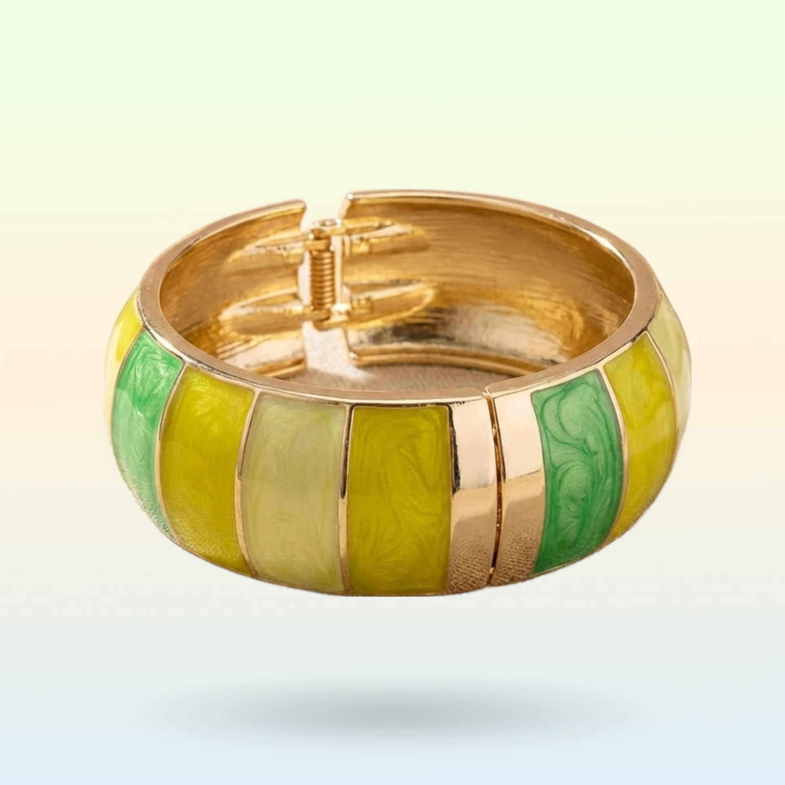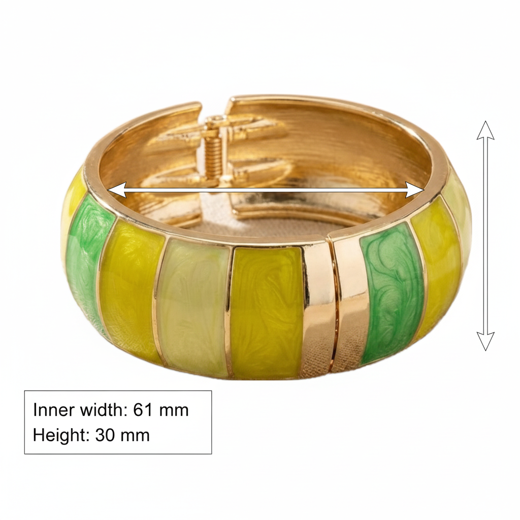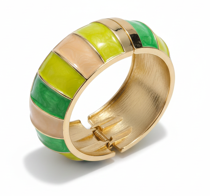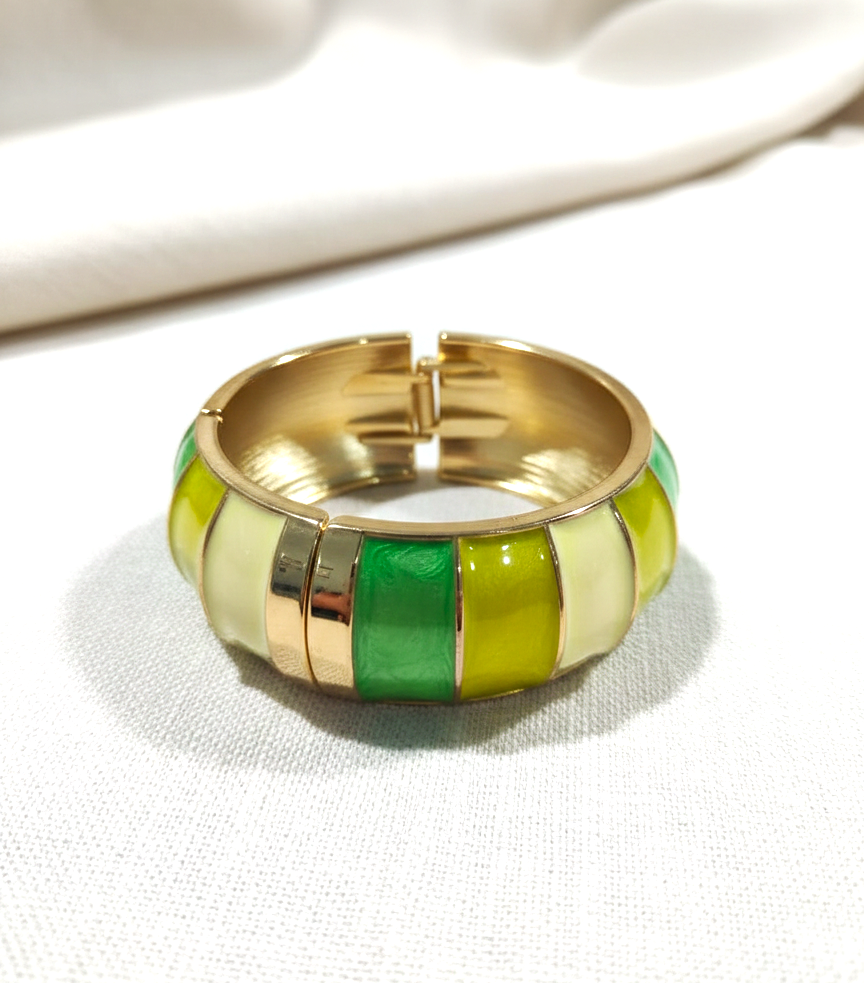Bring a bold pop of color to your style with this designer bangle from VdeLante. Crafted from premium stainless steel and finished with 18K gold plating, this bracelet features glossy enamel panels in refreshing green and yellow tones for a vibrant, modern look.