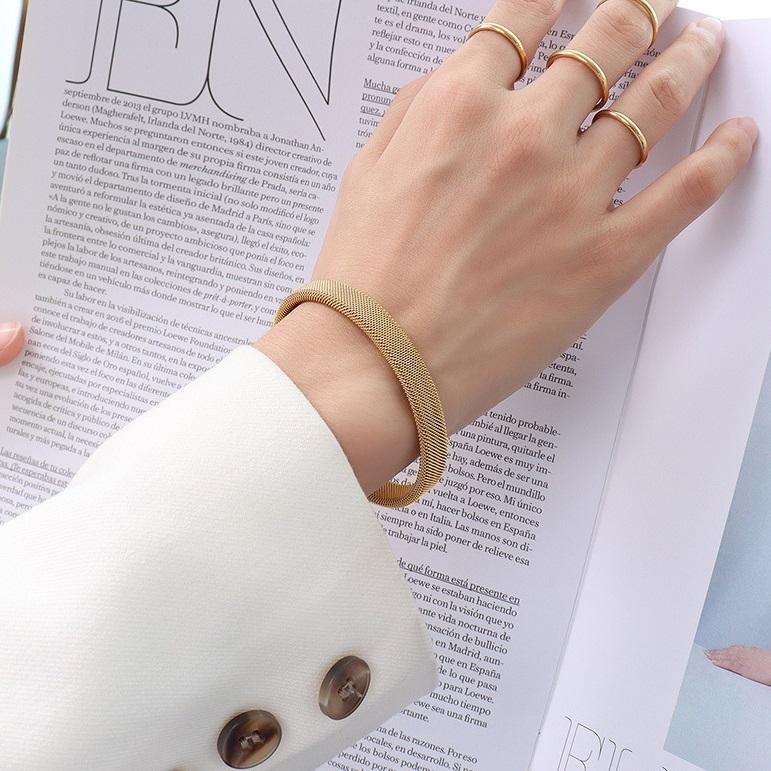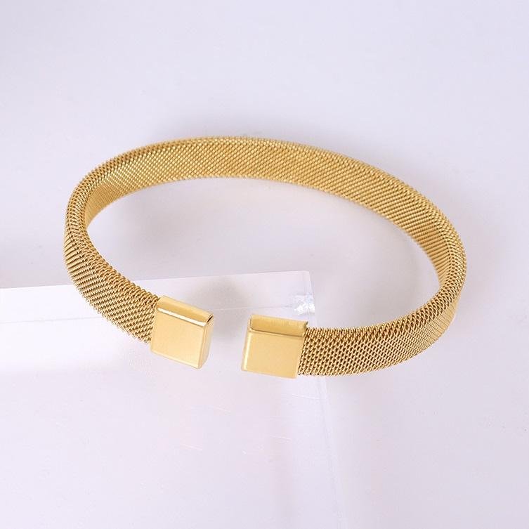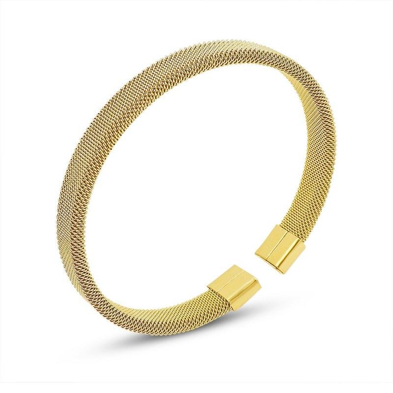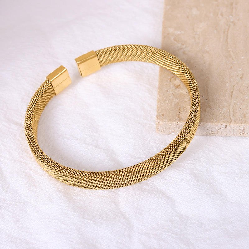 Add effortless sophistication to your look with the Vdelante 18K Gold Plated Open Cuff Bracelet. Designed with a sleek mesh texture and modern open-ended silhouette, this bracelet blends contemporary elegance with everyday comfort. Crafted from premium stainless steel and finished with 18K gold plating, it offers exceptional durability while maintaining a rich, radiant shine. The open cuff design ensures an easy, adjustable fit, making it perfect for all wrist sizes. Lightweight, waterproof, and anti-tarnish, this bracelet is ideal for daily wear without compromising on style. Whether worn solo for a minimalist statement or stacked with other bangles, this piece makes a versatile addition to any jewelry collection and a thoughtful gift for special occasions.