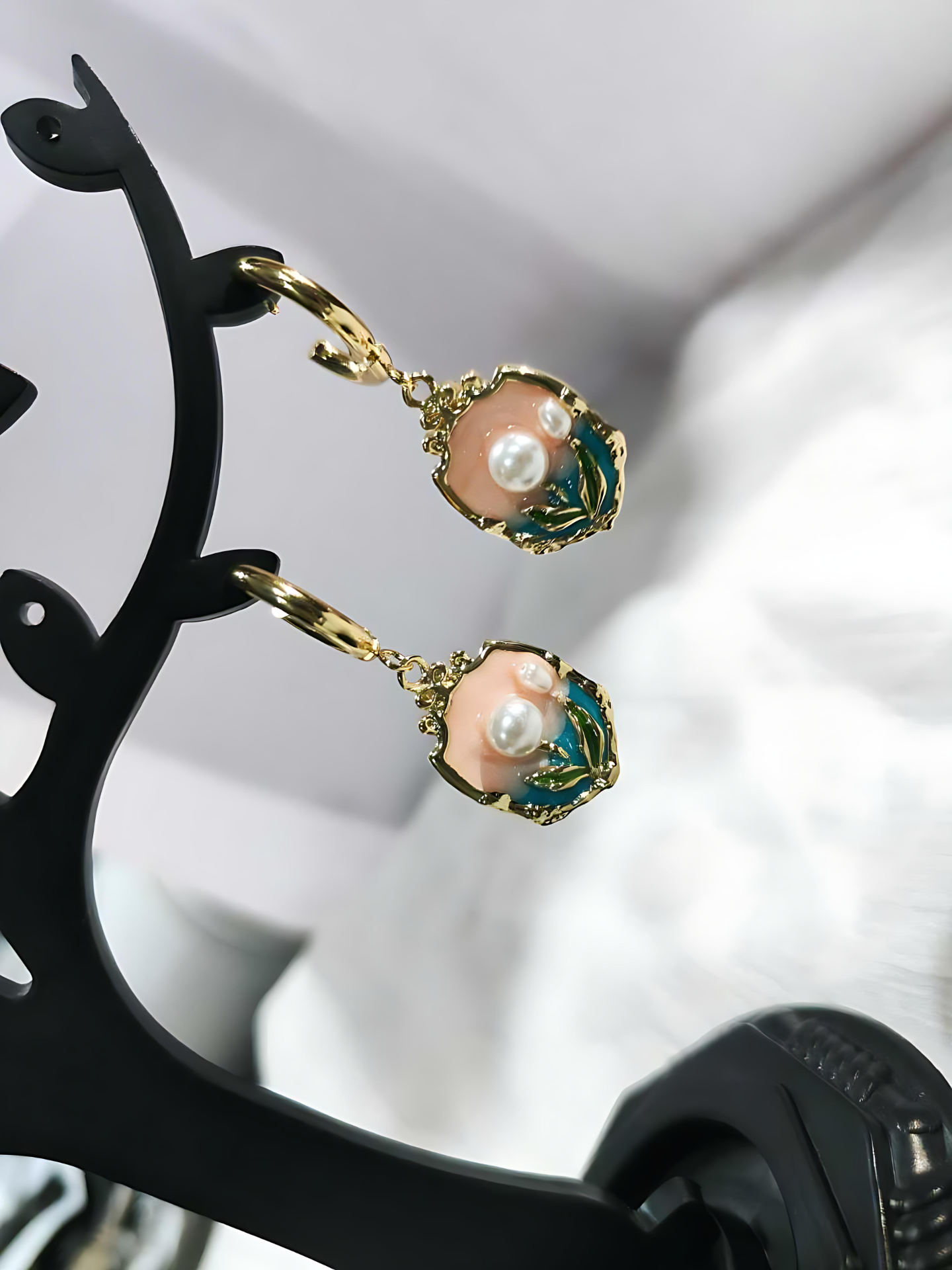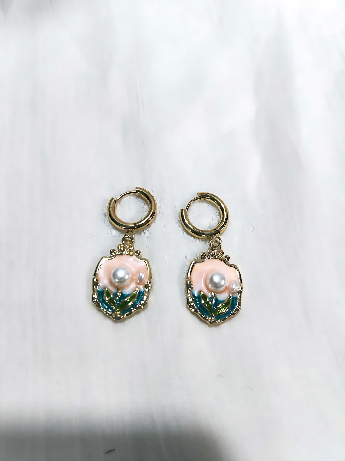 Add a charming pop of color and elegance to your look with these handcrafted enamel pearl drop earrings from VdeLante. Featuring a unique floral design with hand-painted pink enamel, green accents, and a luminous pearl center, these anti-tarnish 18K gold-plated hoops are lightweight, waterproof, and hypoallergenic. Perfect for brunches, date nights, or festive styling, these earrings are where artistry meets durability.