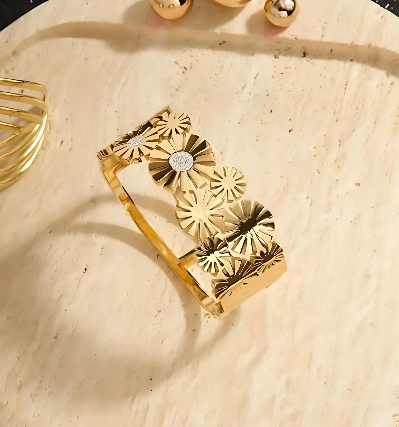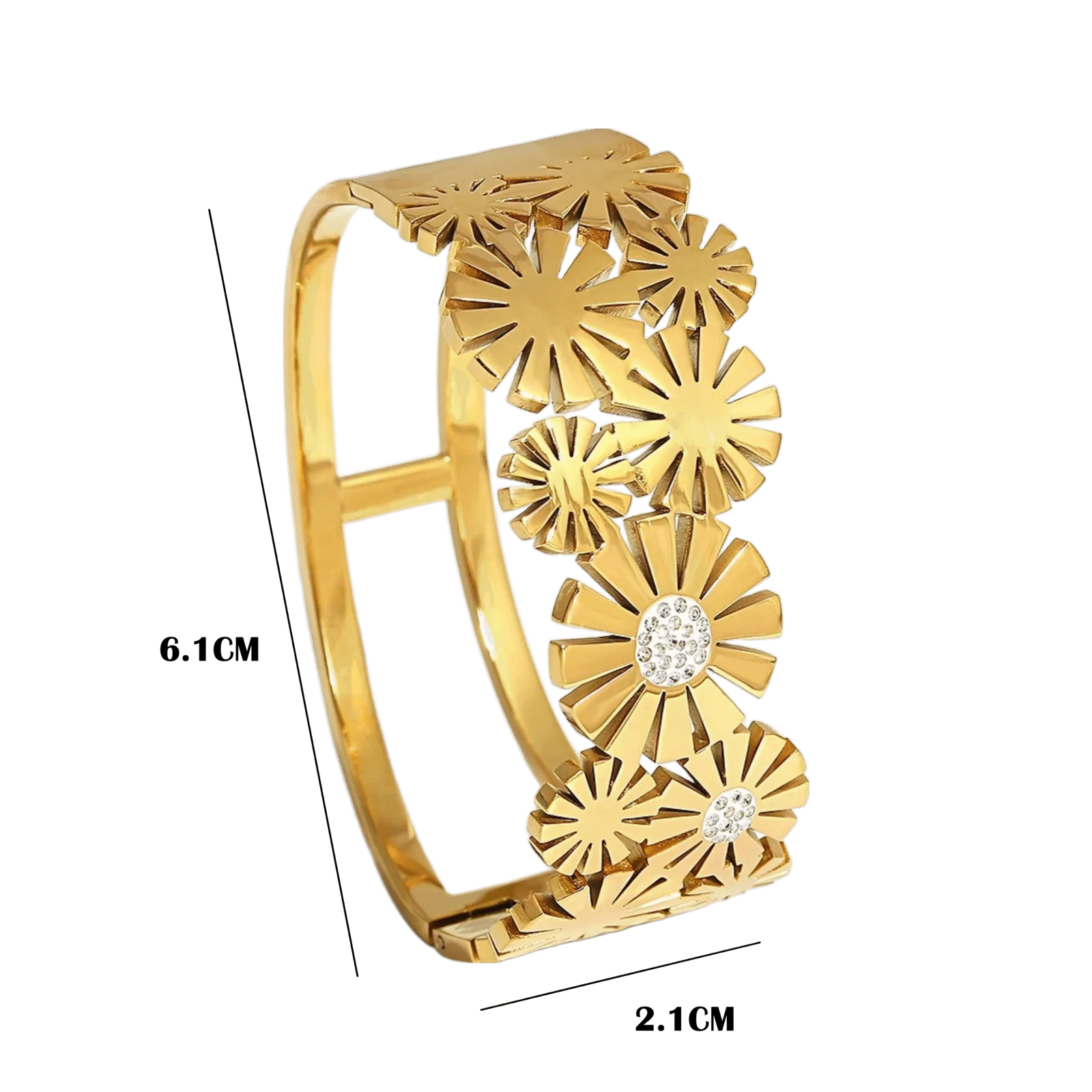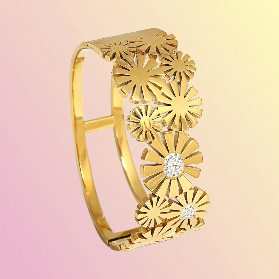Make a bold impression with VdeLante’s floral-themed statement bracelet. Crafted from premium stainless steel and plated with 18K gold, this open-style kada features intricate flower cutouts with zircon-studded centers. The anti-tarnish, waterproof, and hypoallergenic design makes it perfect for everyday glam or festive occasions. Elevate your wristwear with jewelry that’s as radiant as you are.