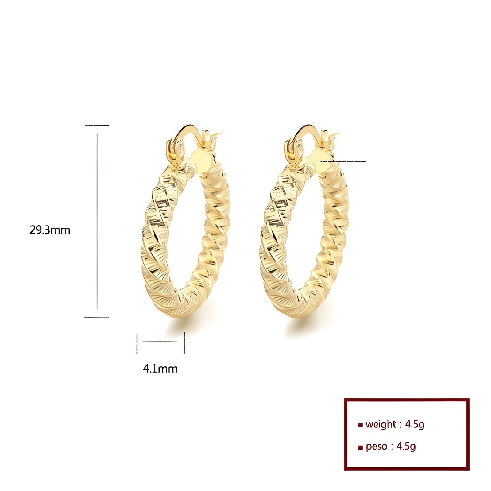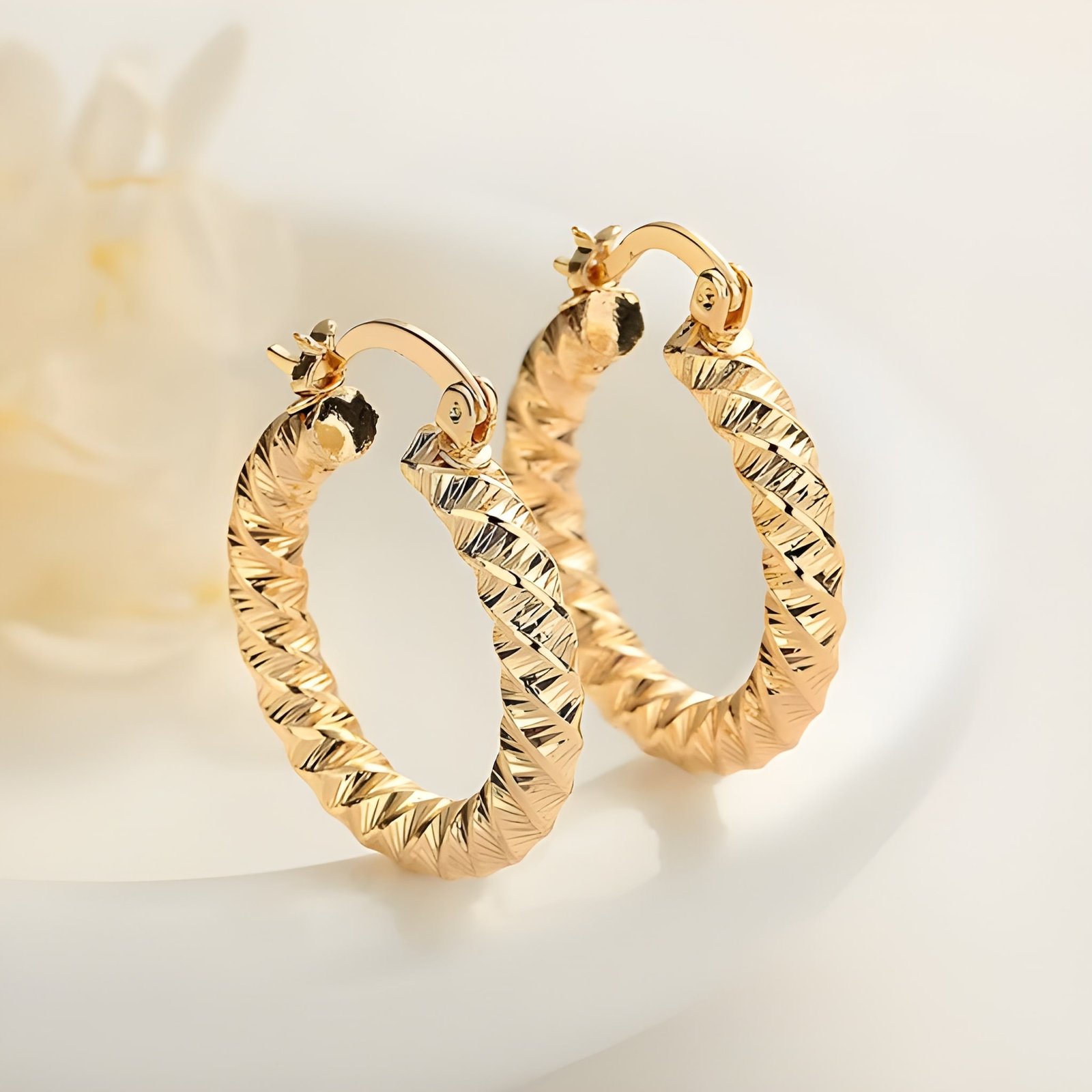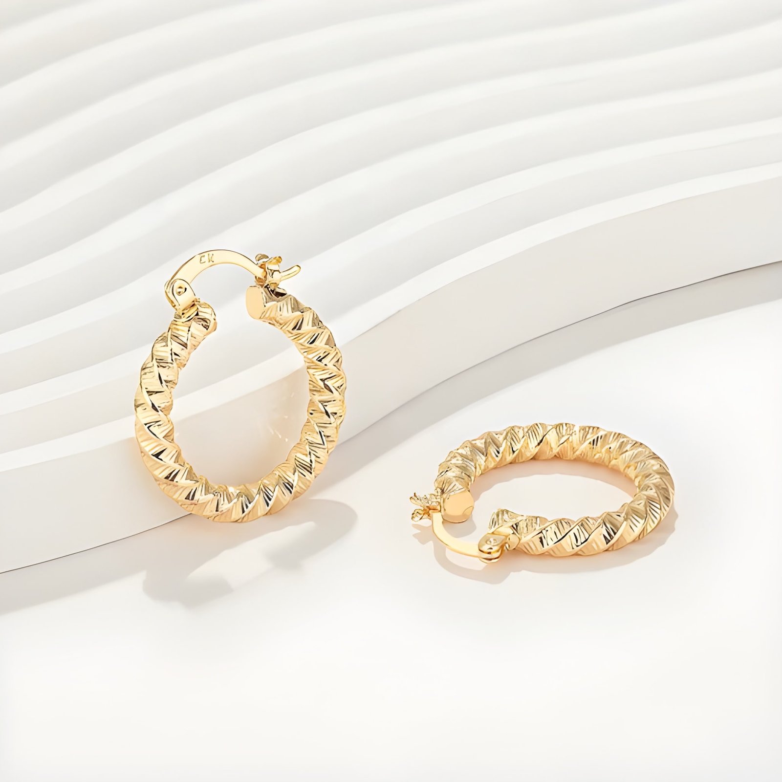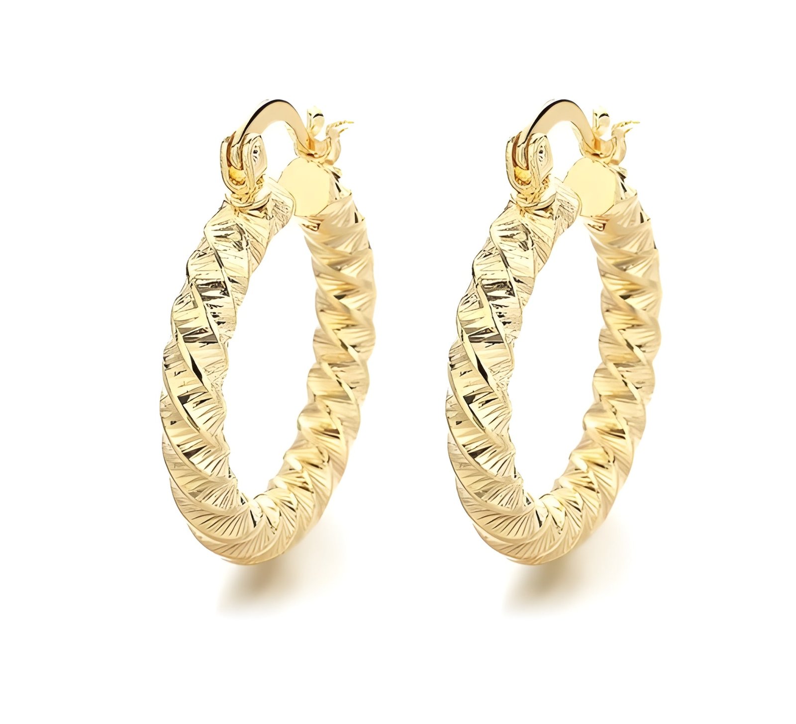 These stunning rose gold hoops are the essential accessory you’ve been searching for. They strike the perfect balance between classic hoop elegance and contemporary texture, featuring a meticulously carved twisted pattern that adds depth and unique sparkle. The beautiful 18K Gold finish provides a warm, romantic glow that is universally flattering.