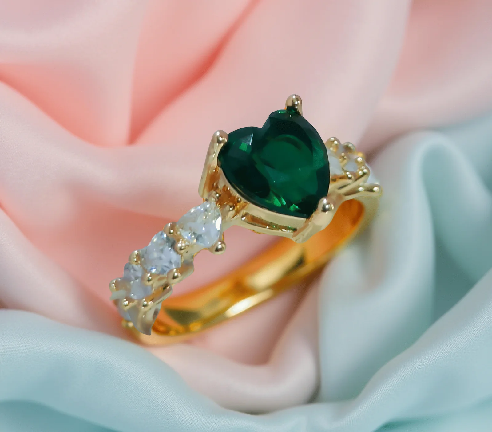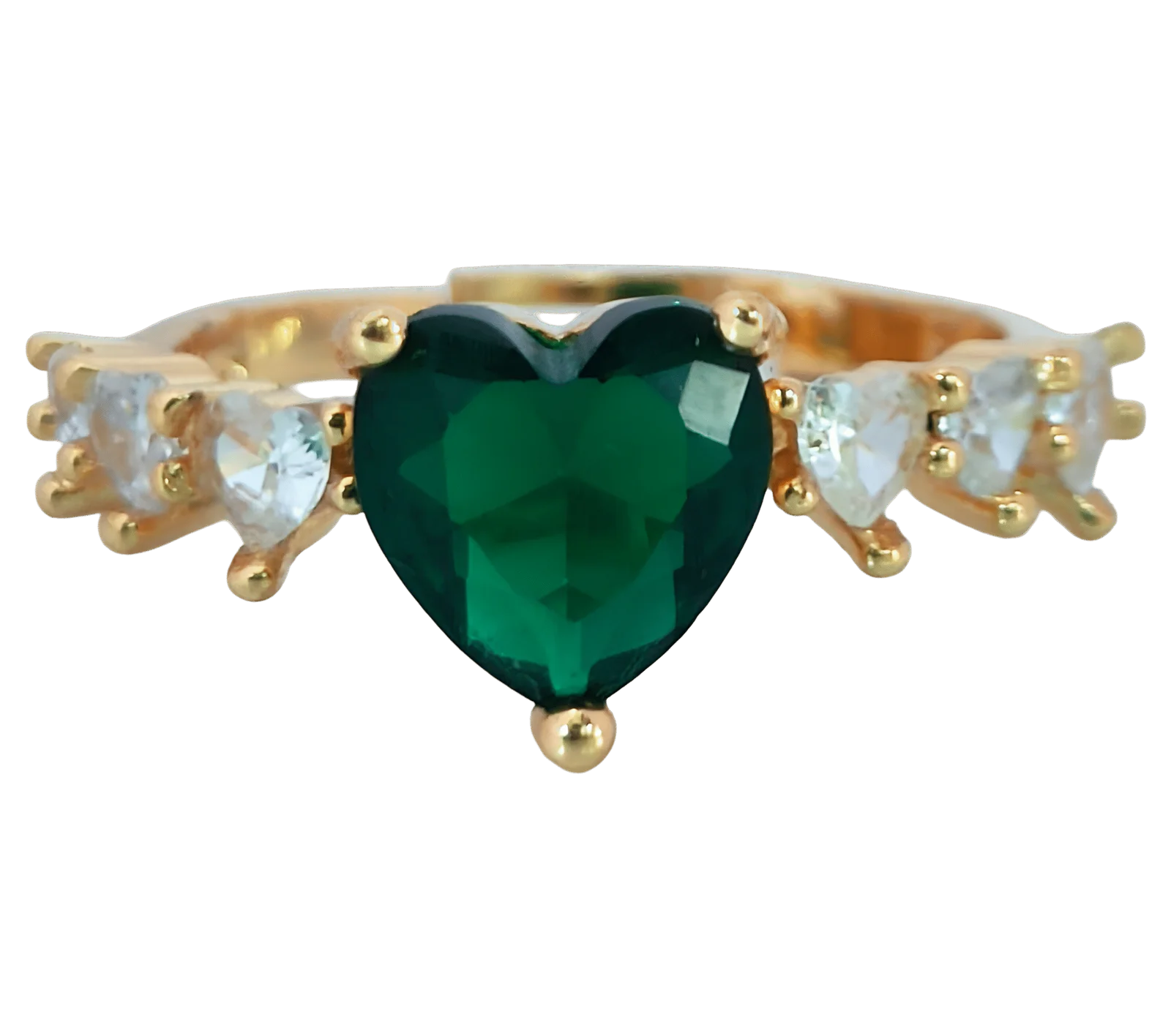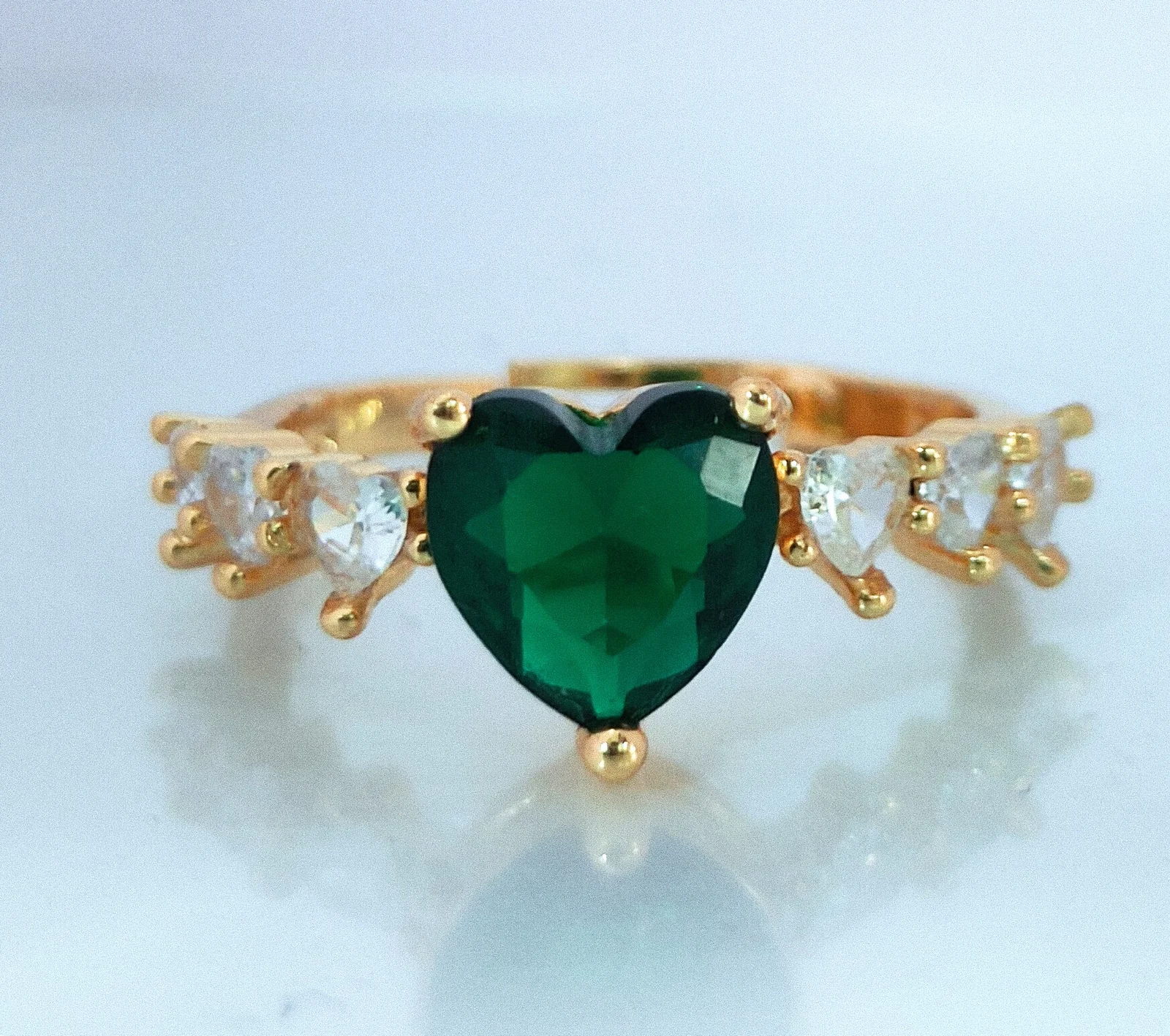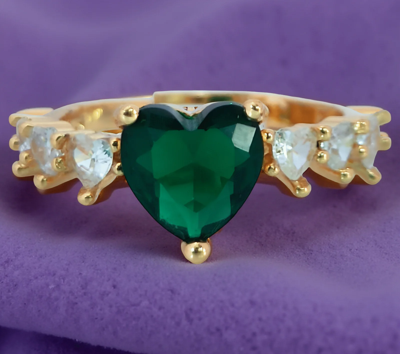 Make a lasting impression with this stunning Heart Green Zircon Ring, beautifully crafted with a bold emerald-green heart-cut center stone and flanked by six shimmering white heart-shaped cubic zirconia stones. Plated in 18K gold, this elegant piece is perfect as a promise ring, engagement ring, or a romantic gift for birthdays, anniversaries, or Valentine’s Day. A captivating blend of color, sparkle, and sentiment.