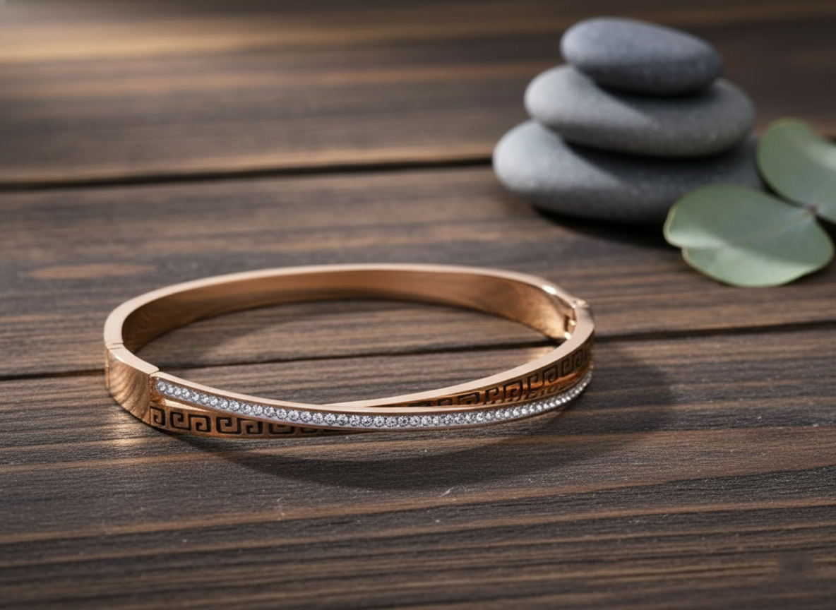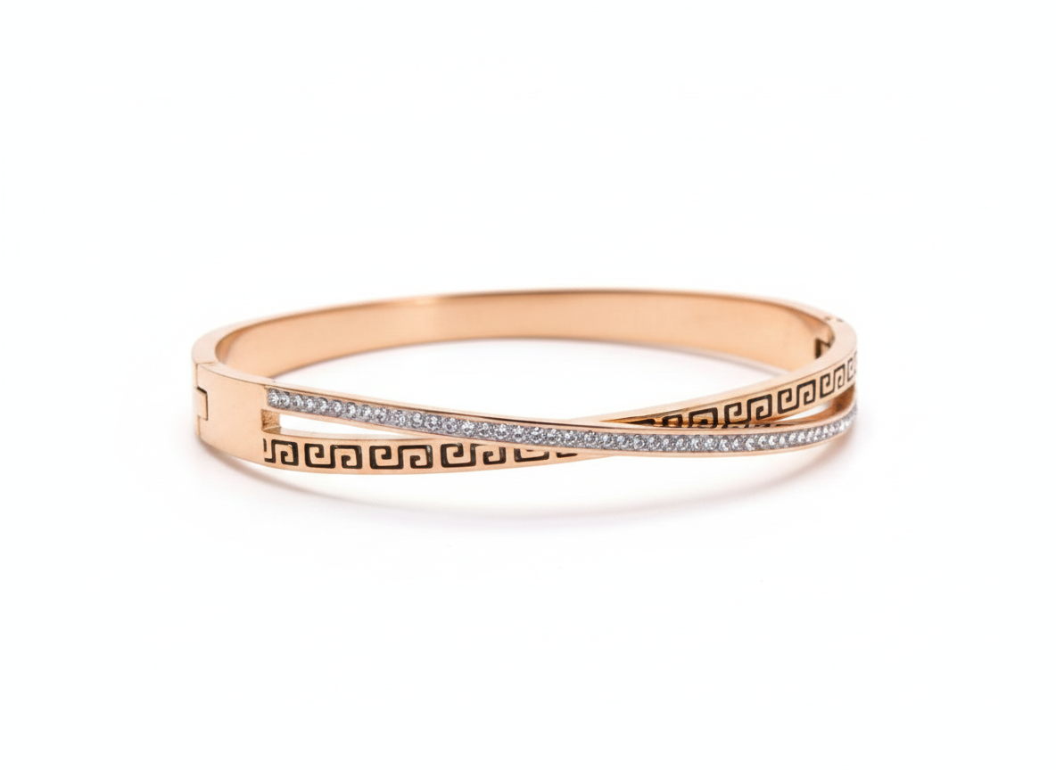 The intricate lattice pattern is adorned with delicate zircon stones, offering a perfect balance of structure and sparkle. Its kada-style form makes it an eye-catching statement piece for festive events, weddings, or evening wear. With anti-tarnish and waterproof properties, this bracelet is built to last while staying effortlessly elegant.