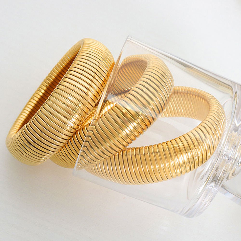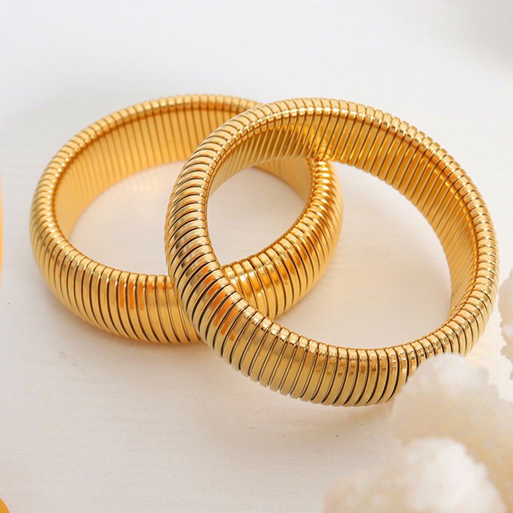 Elevate your everyday style with the Vdelante 18K Gold Plated Coil Bracelet, a modern designer bangle crafted for elegance, comfort, and durability. Featuring a sleek ribbed coil design, this bracelet offers a flexible fit that slips on effortlessly while maintaining a luxurious gold finish.
