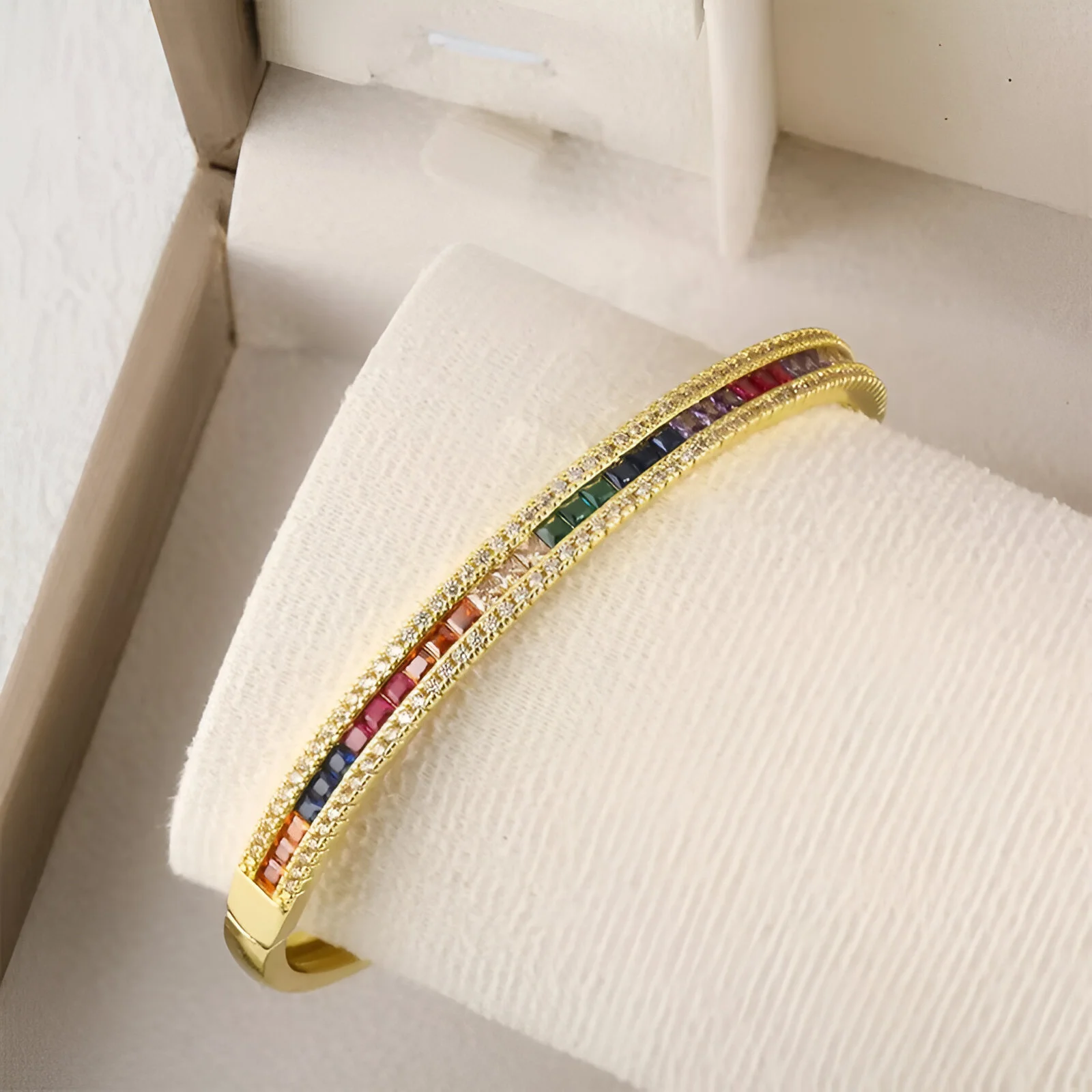 Featuring a unique corrugated oval design, this bracelet is delicately inlaid with multi-colored zircon stones, offering a playful yet refined aesthetic. Each stone is precisely set to catch the light and create a subtle, sophisticated sparkle with every movement.