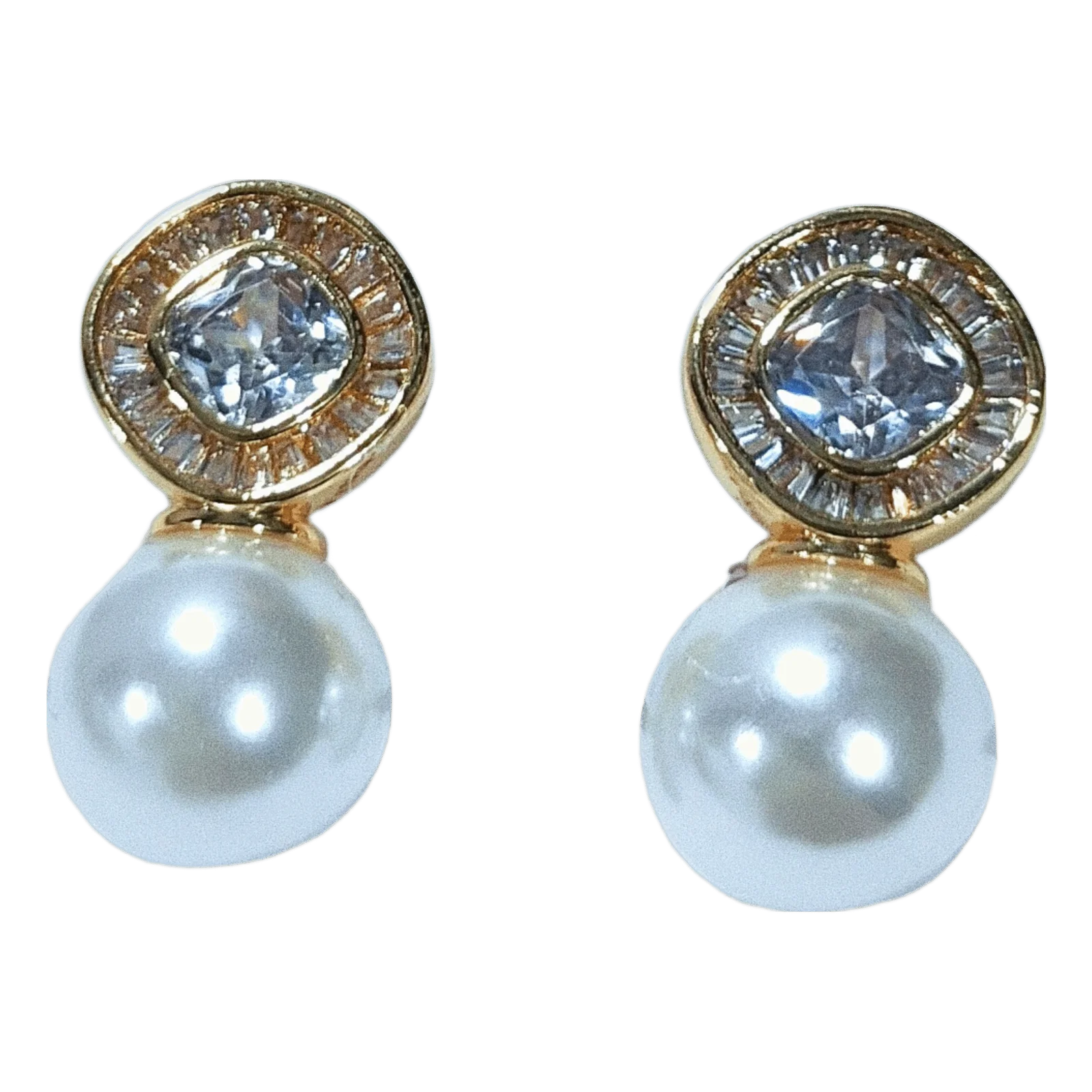 Add a timeless touch to your jewelry collection with these VdeLante 18K Gold Plated Pearl & Crystal Earrings. Featuring a brilliant round-cut crystal center surrounded by a halo of baguette-cut cubic zirconia, the design flows into a graceful faux pearl drop.