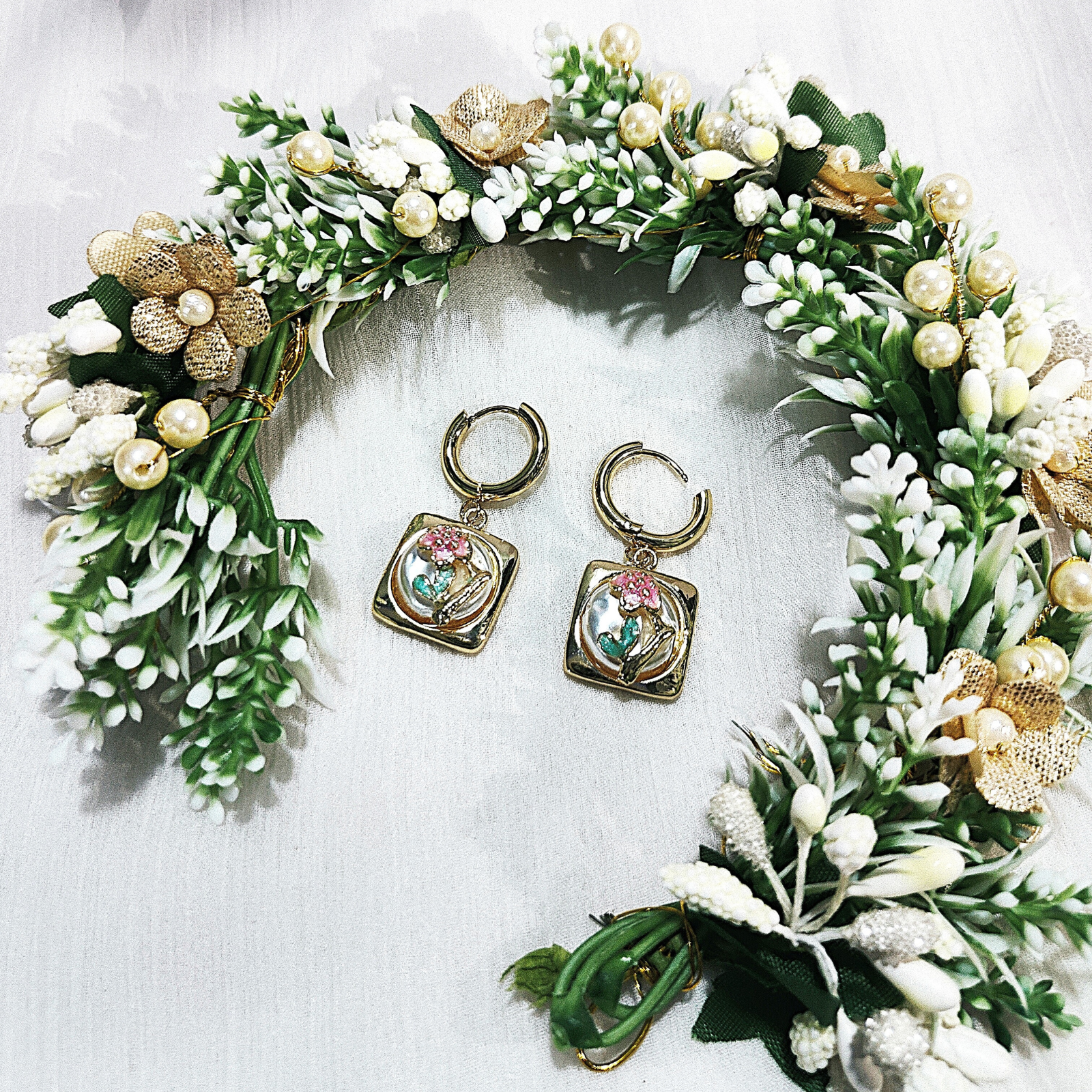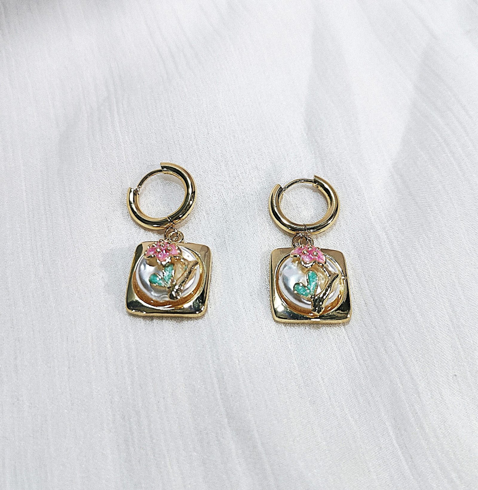 Grace your look with floral elegance and timeless charm. VdeLante’s 18K gold plated earrings feature a glossy pearl-like enamel base adorned with a pink flower and green leaf design. These lightweight, anti-tarnish drop earrings are waterproof and hypoallergenic—perfect for women who love playful yet refined fashion. Ideal for casual wear, gifting, or spring-inspired styling.