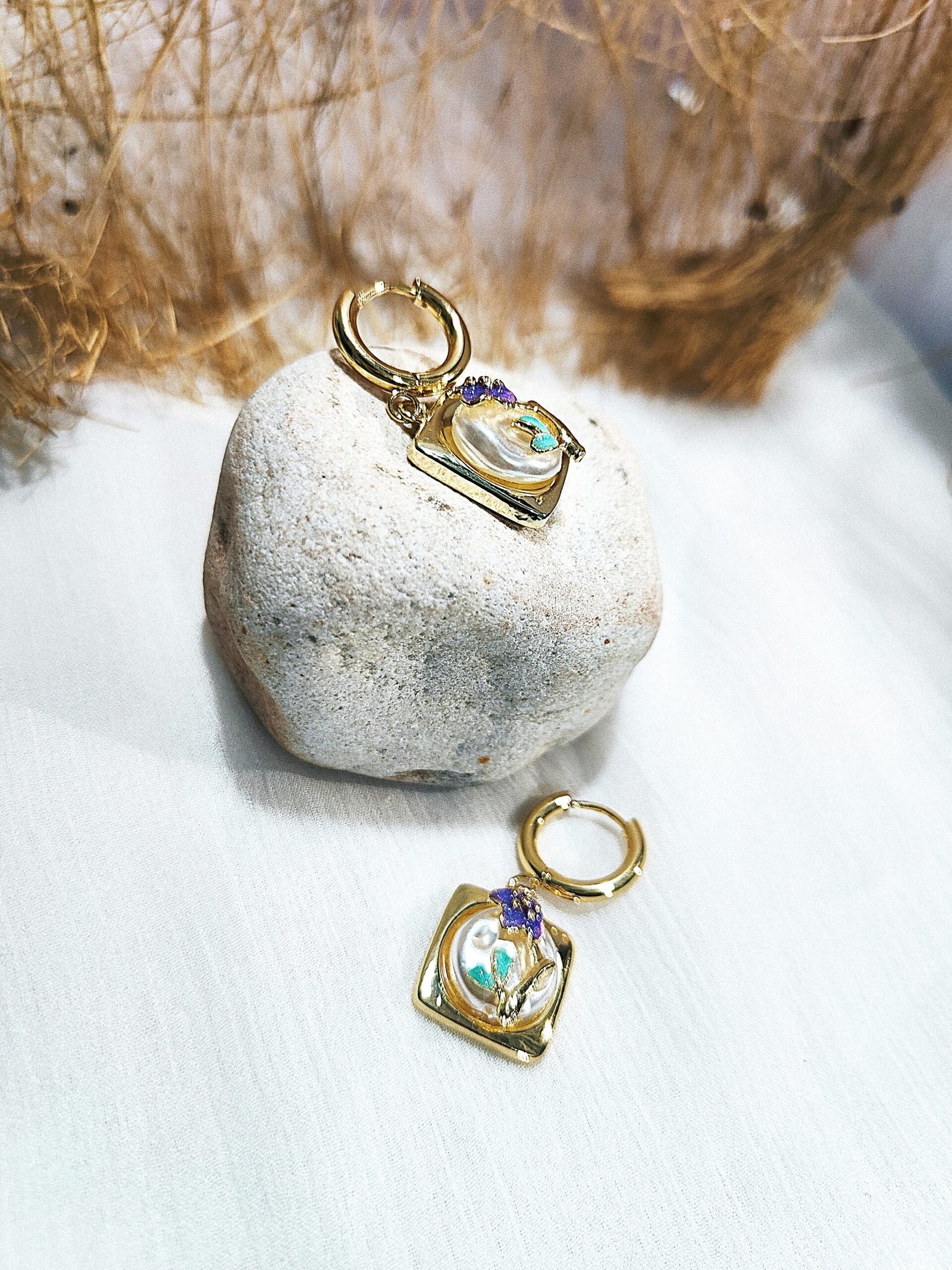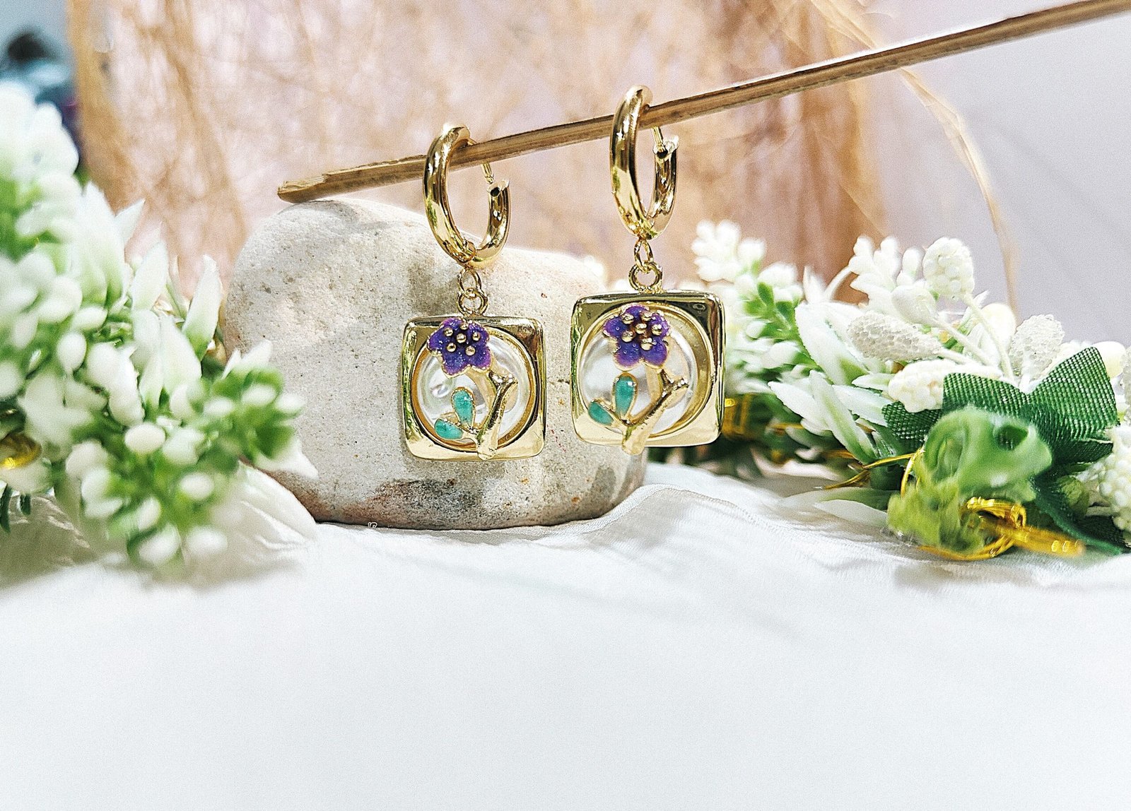 Step into elegance with VdeLante’s signature floral drop earrings. These 18K gold plated hoops feature a unique square enamel charm showcasing a delicate purple flower with a green leaf. Designed with a glossy pearl-like base, these earrings are anti-tarnish, waterproof, and skin-safe—perfect for everyday glam or special occasions. Stylish yet subtle, they blend whimsy and charm for a fashion-forward finish.