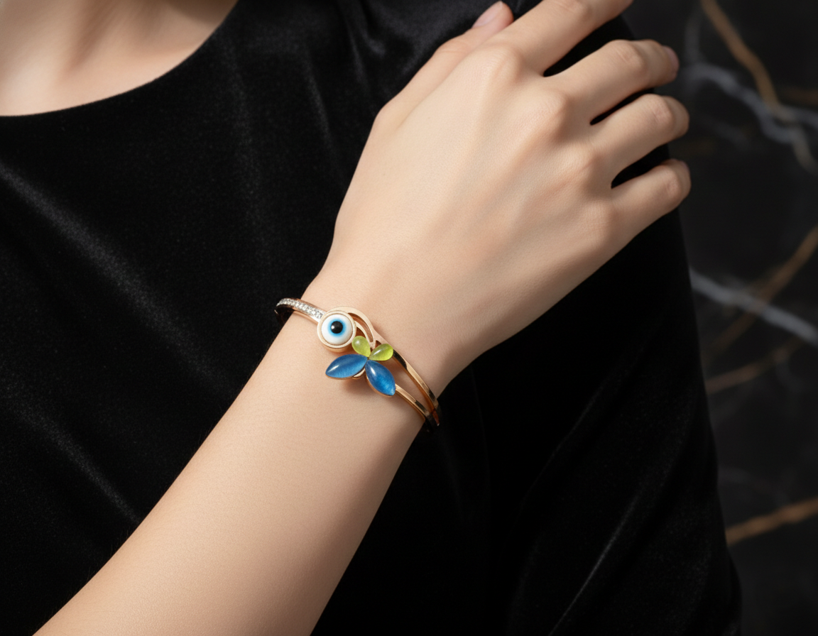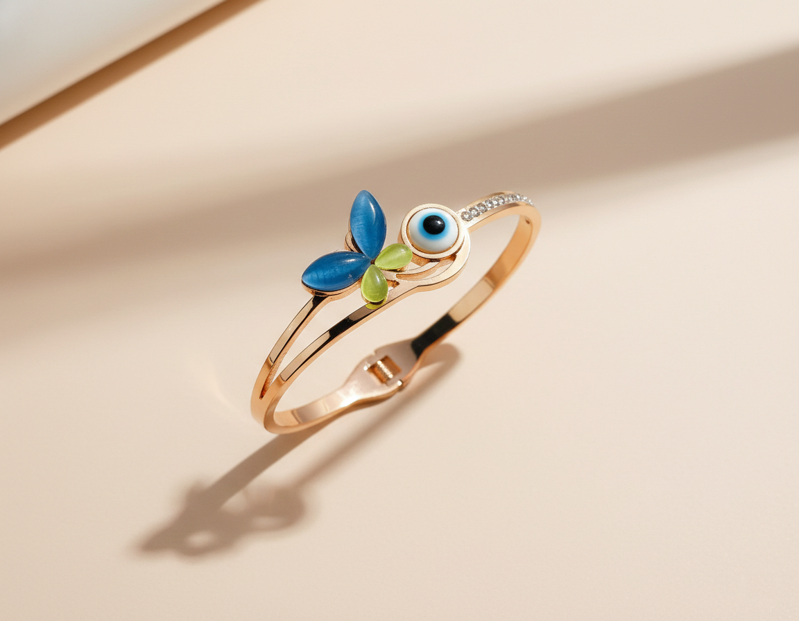 The design features a graceful butterfly motif paired with a captivating blue evil eye charm—symbolizing transformation, protection, and positivity. Sparkling zircon accents add just the right amount of shine, making this piece perfect for both daily wear and festive occasions.