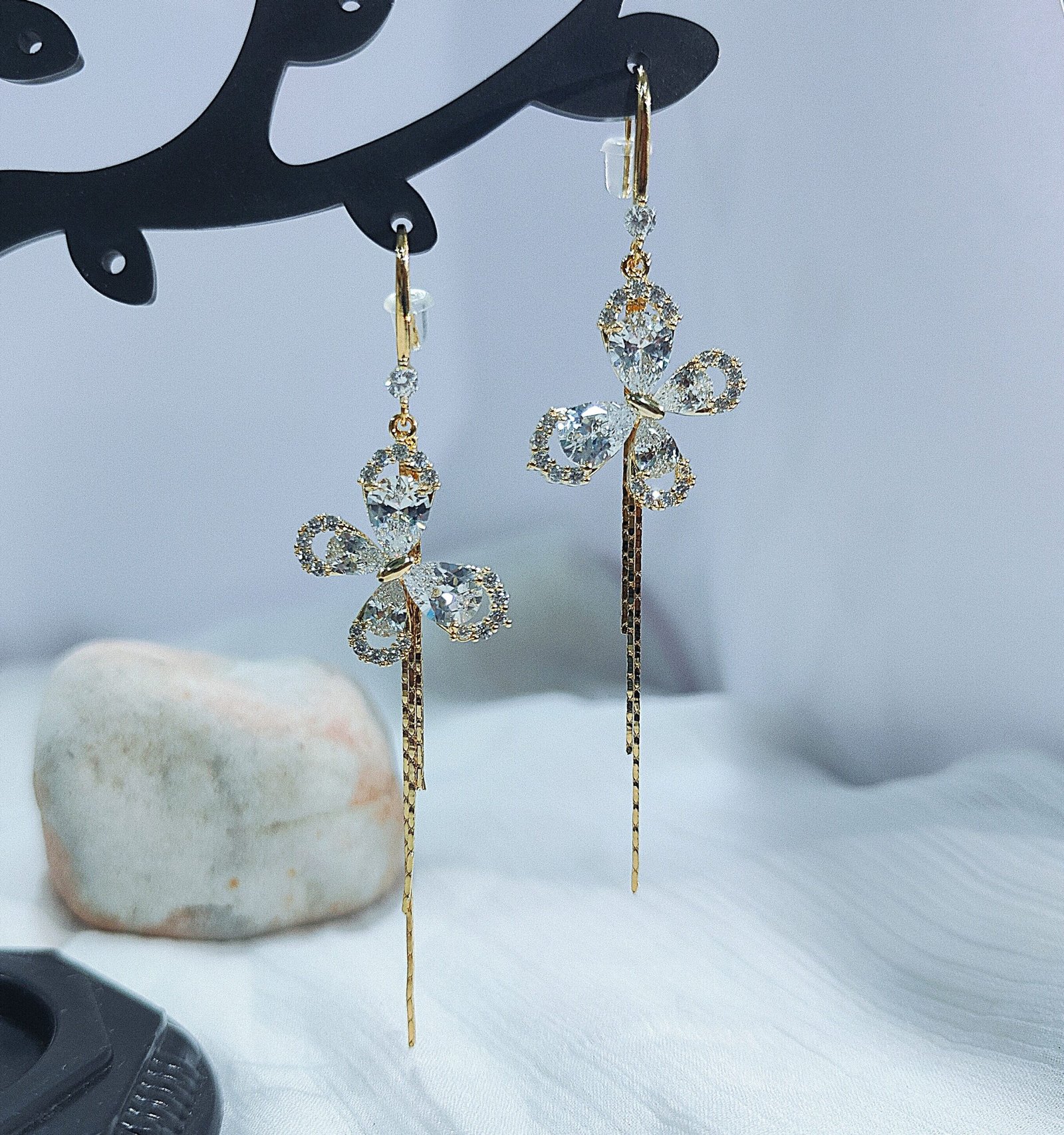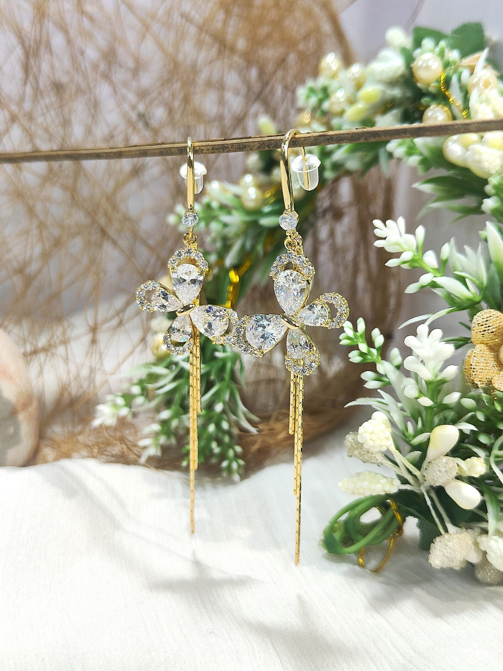 Add a touch of sparkle and elegance with VdeLante’s butterfly dangle earrings. Beautifully crafted in 18K gold plating, each piece features a dazzling butterfly made with teardrop-cut zircon crystals and a flowing gold chain tassel for graceful movement. Anti-tarnish and waterproof, these earrings are perfect for festive occasions, date nights, or elevating your everyday style with charm and shimmer.