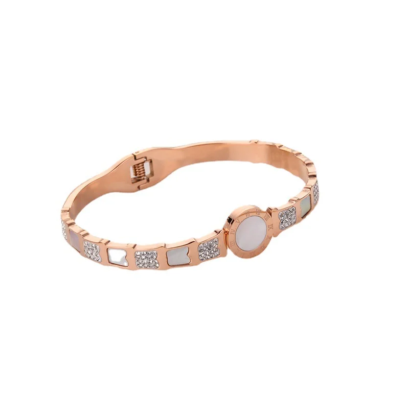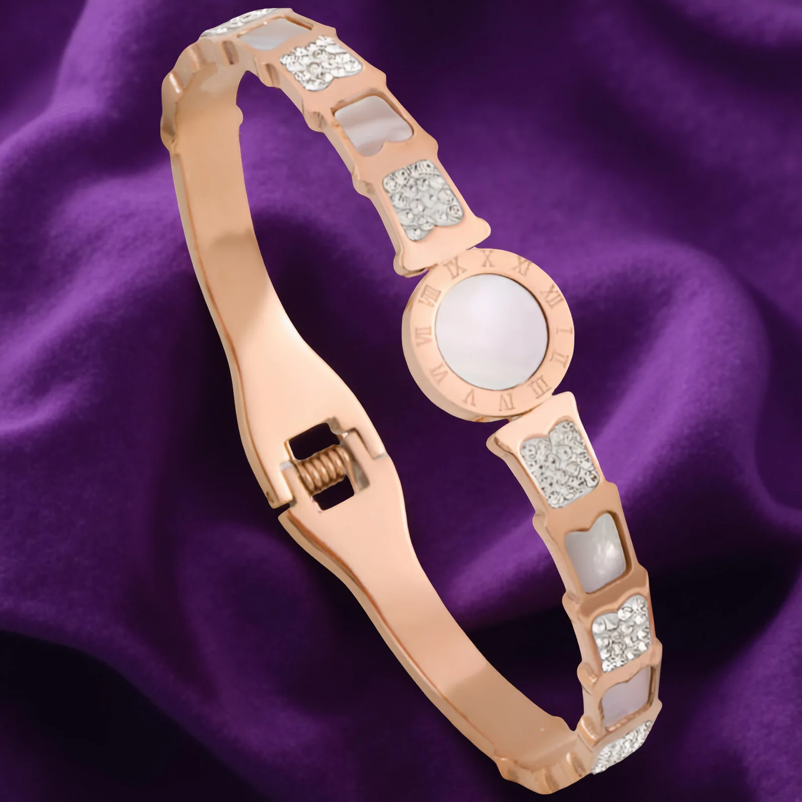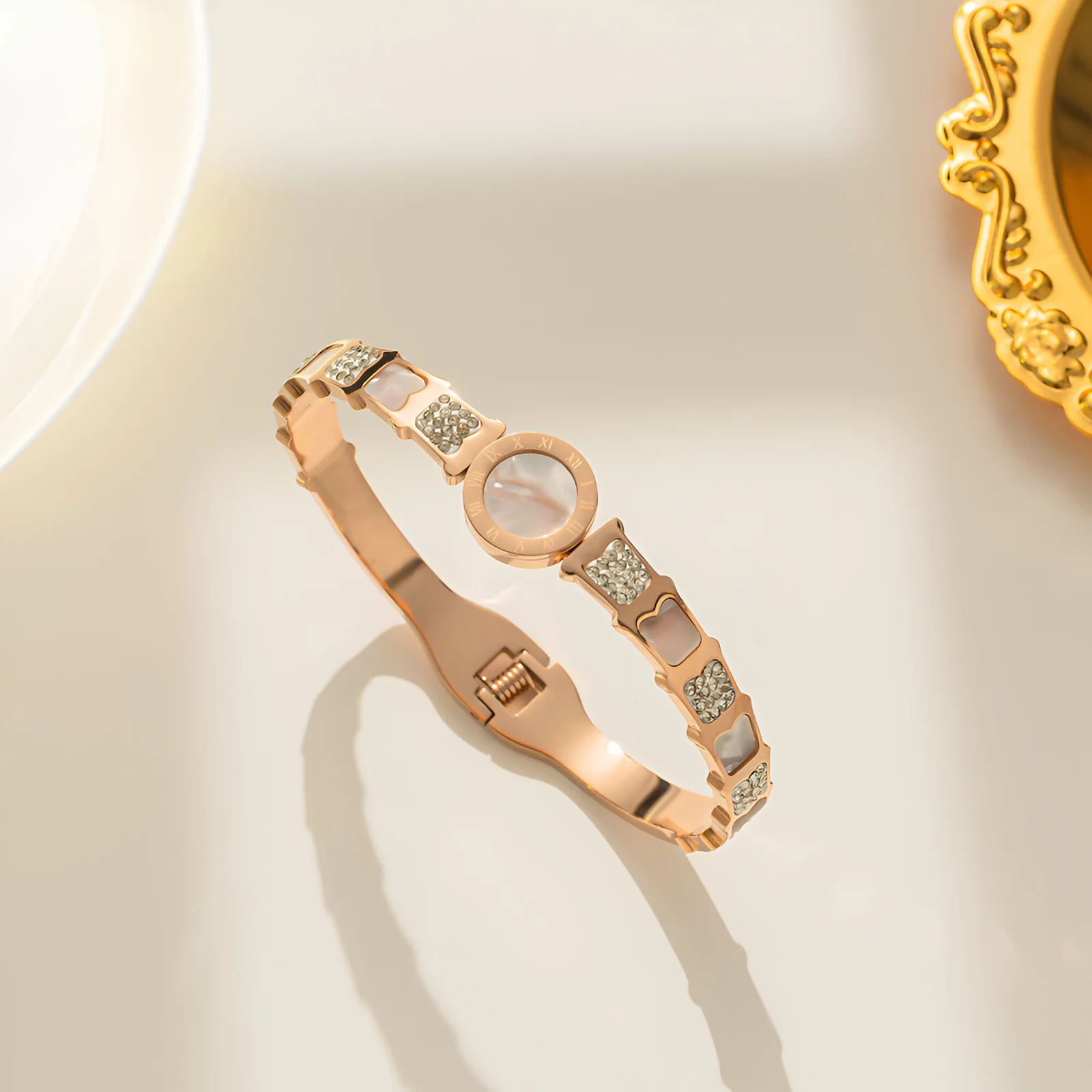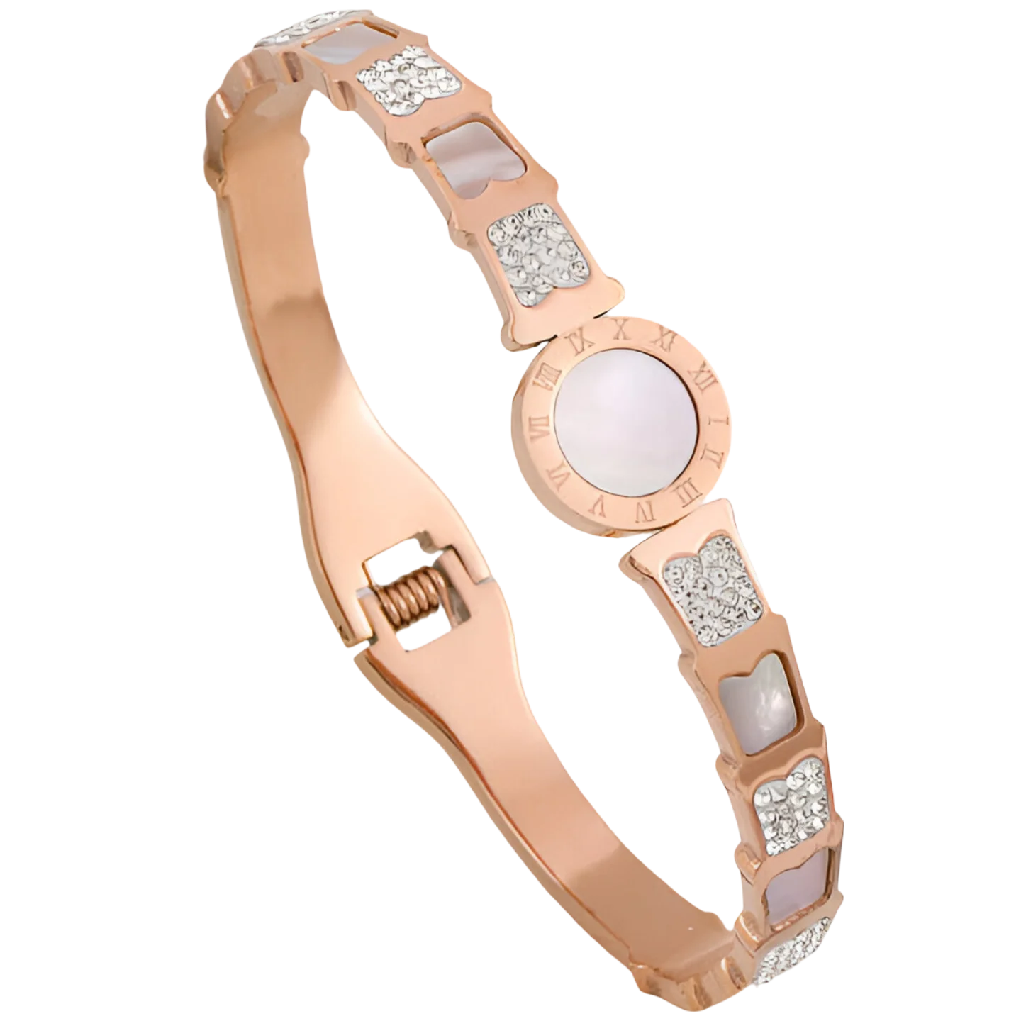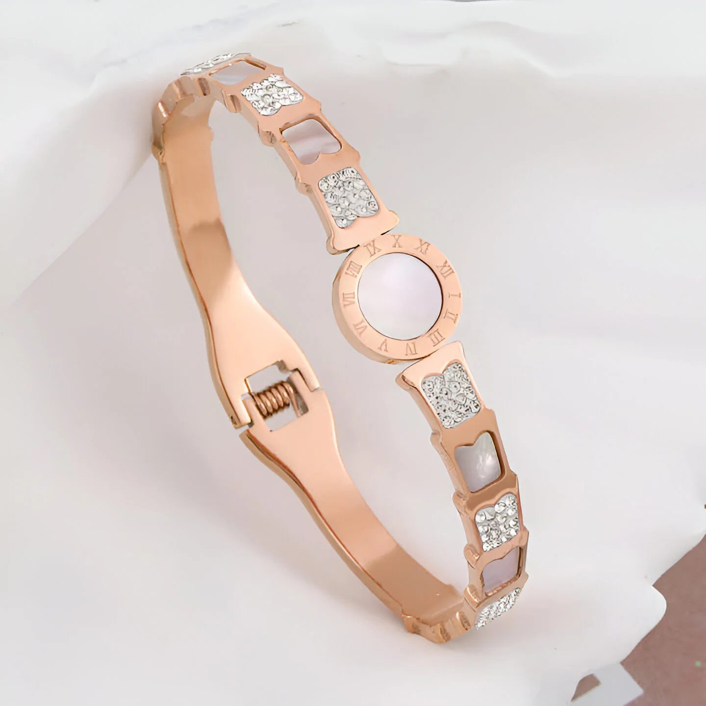Embrace refined elegance with the VdeLante Snake Splicing Crystal Bracelet — a dazzling blend of craftsmanship and contemporary design. This 18K PVD rose gold plated bracelet features a snake-splice pattern made from premium stainless steel, artfully adorned with shimmering zircon stones and natural shell inlays. The central round Roman dial-style accent adds a luxurious vintage charm, making it a standout accessory for both day and night looks.