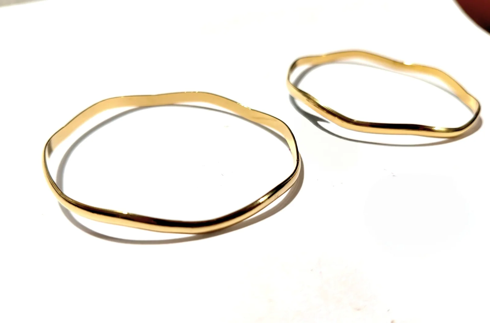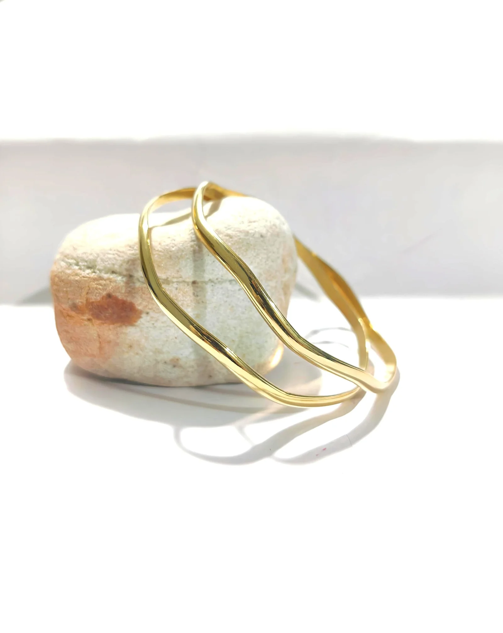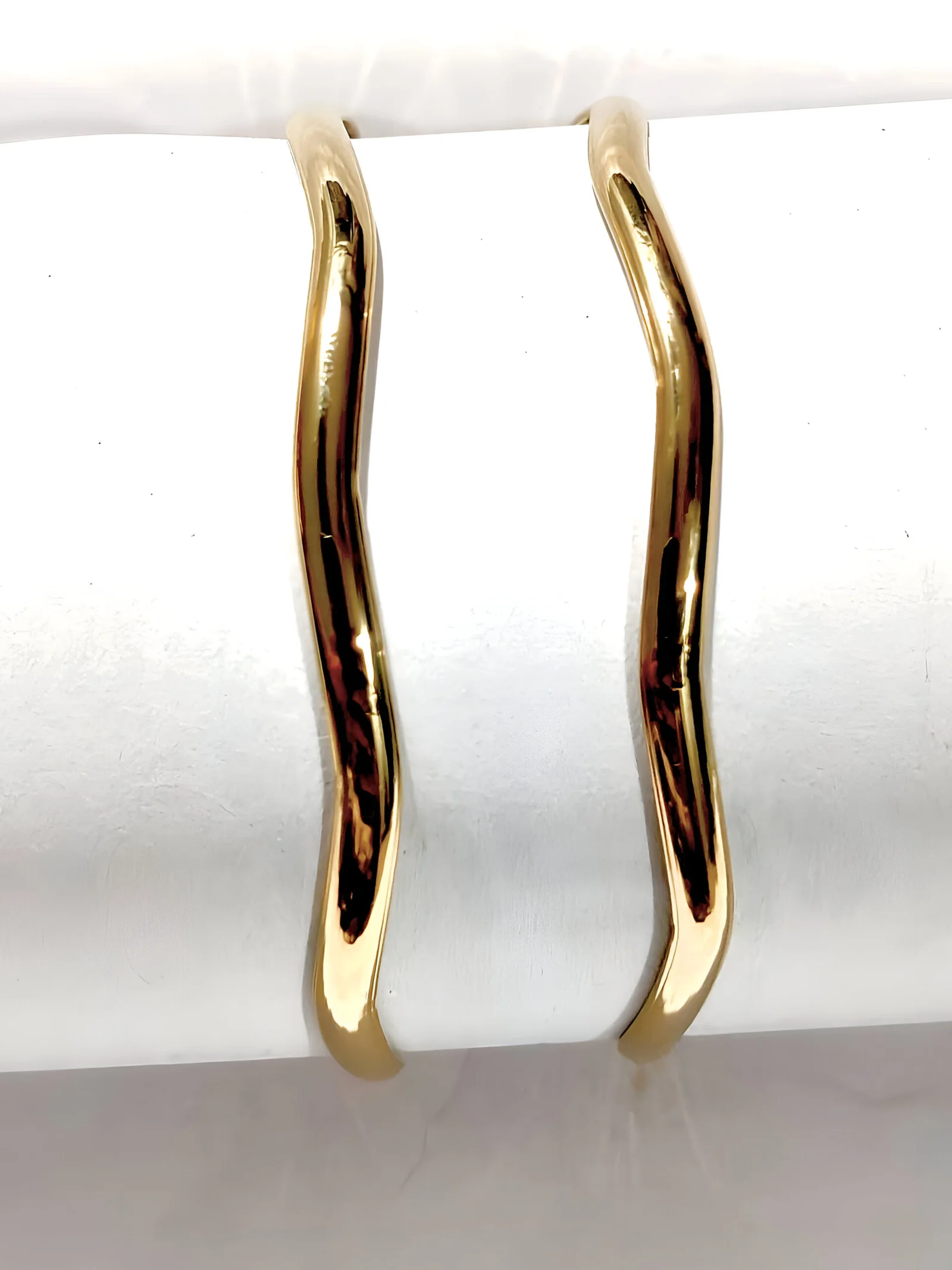 Elevate your everyday elegance with the VdeLante set of two bangles, crafted from high-quality stainless steel and plated with luxurious 18K PVD gold. Designed for the modern woman, these bangles feature a sleek, wavy silhouette that effortlessly blends classic charm with contemporary minimalism.